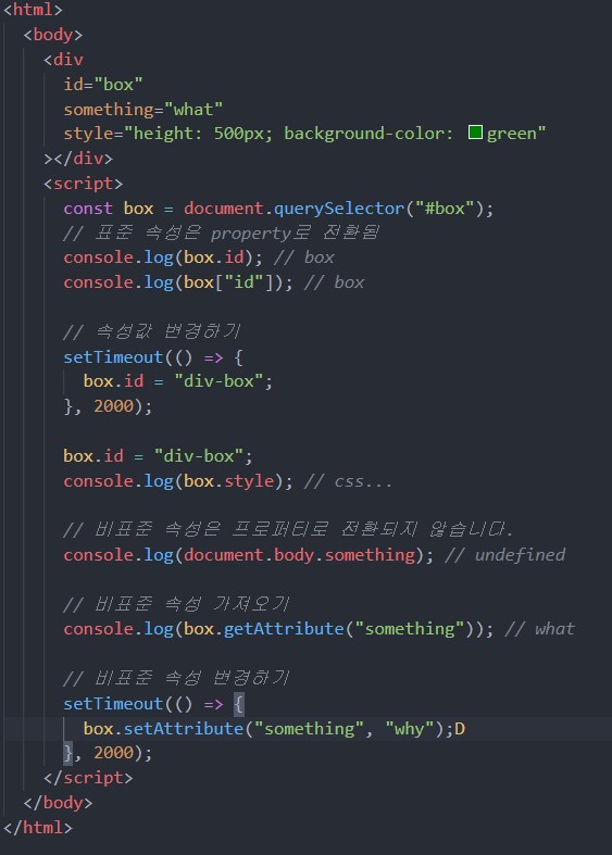 물론 위의 사진처럼 setAttribute라는 것을 이용하여 비표준 속성을 변경할 수도 있습니다.