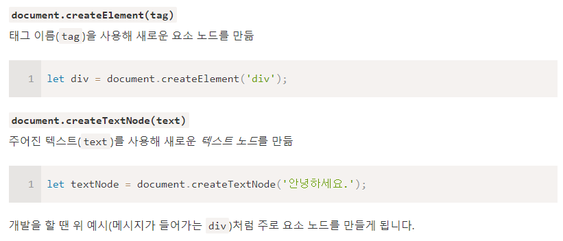 먼저 DOM 노드를 만들때 쓰는 두가지 메서드가 있습니다.