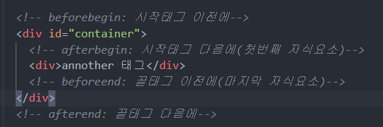 • beforeend : 끝태그 이전에(마지막 자식요소)