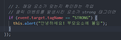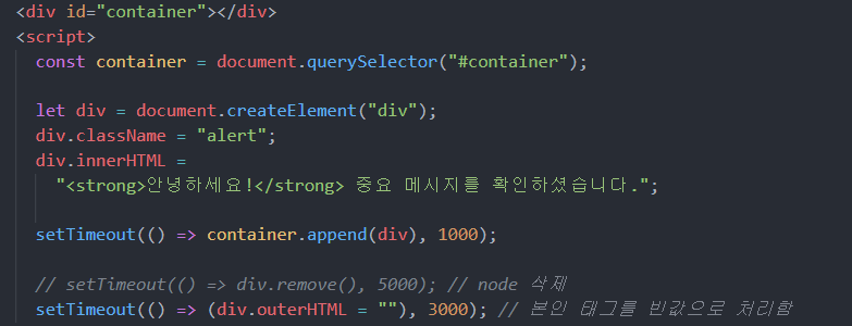 보시면 container의 첫번째 자식요소에 동적으로 alert가 생성이 된것이죠