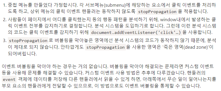 커스텀 이벤트는 나중에 추후에 배우겠지만 그래도 일단을 버블링을 막는 메서드는 알고있는게 좋습니다.